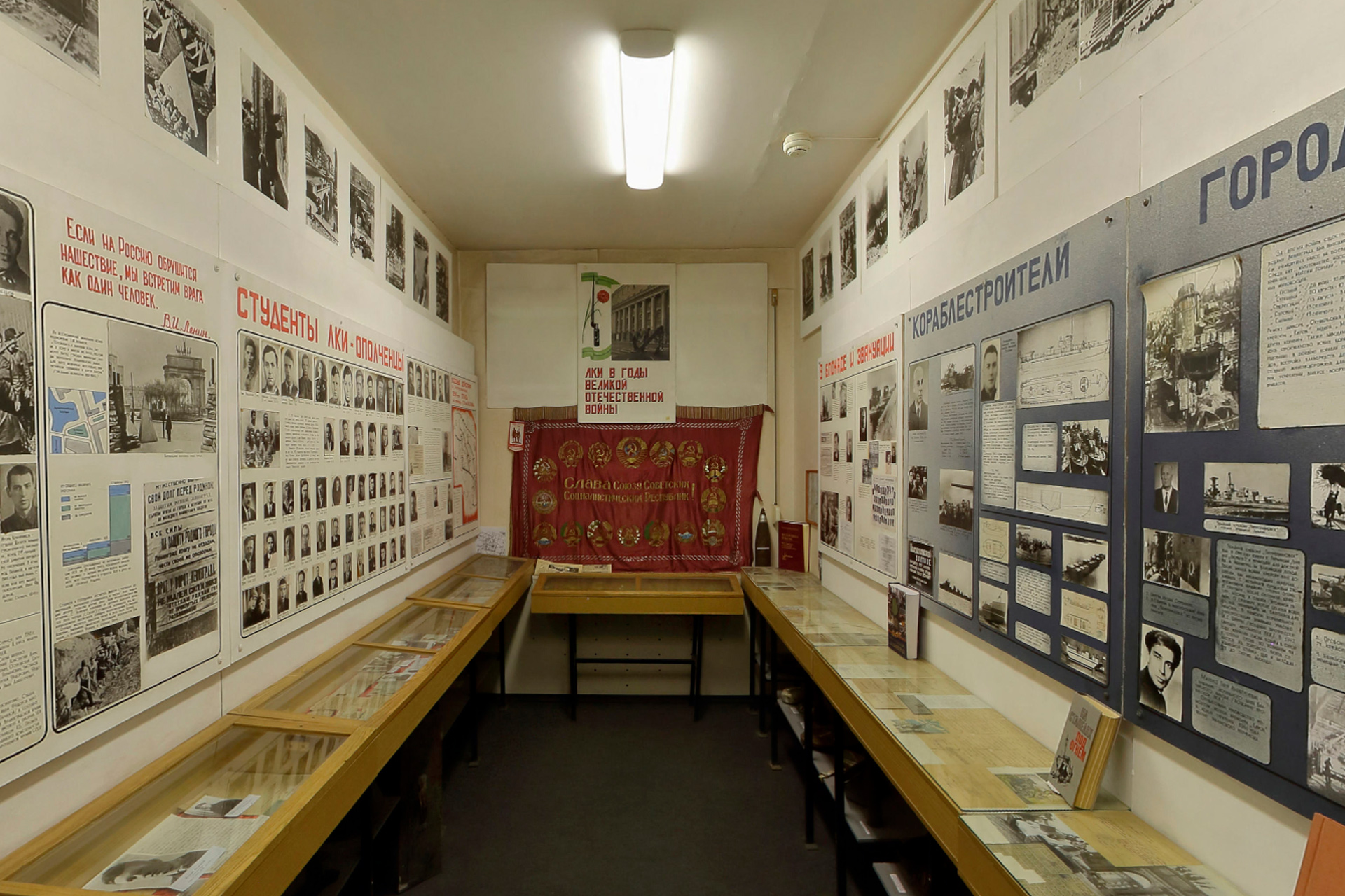 Важную роль в музейной экспозиции играет зал, посвящённый истории «Корабелки» в годы Великой Отечественной войны. Здесь посетители узнают, как сверстники нынешних студентов, юноши и девушки, в трудную годину встали на защиту Родины, и многие сложили головы, но не пропустили врага в Ленинград. История формирования, обучения и боевых действий 264-го отдельного пулемётно-артиллерийского батальона (ОПАБ), костяк которого состоял из корабелов – студентов, преподавателей и сотрудников, инженеров и рабочих-кораблестроителей, демонстрирует, как люди в экстраординарных условиях способны сплотиться в единый организм и успешно взаимодействовать для достижения сложной задачи, подобную которой им до этого решать не приходилось. Познакомившись с материалами экспозиции, посетитель музея узнаёт, что 264 ОПАБ встретил врага на территории Петергофа, в Луговом парке, создававшемся в период правления императора Николая I. Здесь, среди холмов и озёр, в первой половине XIX века были построены павильоны для отдыха царского семейства – Бельведер, Розовый павильон – вокруг которых в сентябре 1941 года разгорелись жесточайшие бои с хорошо оснащённым и обученным противником. Приведённые в экспозиции материалы сообщают, что в результате ожесточённых боёв 20–24 сентября 1941 года большинство бойцов 264 ОПАБ погибли, но не пропустили врага к Ленинграду.