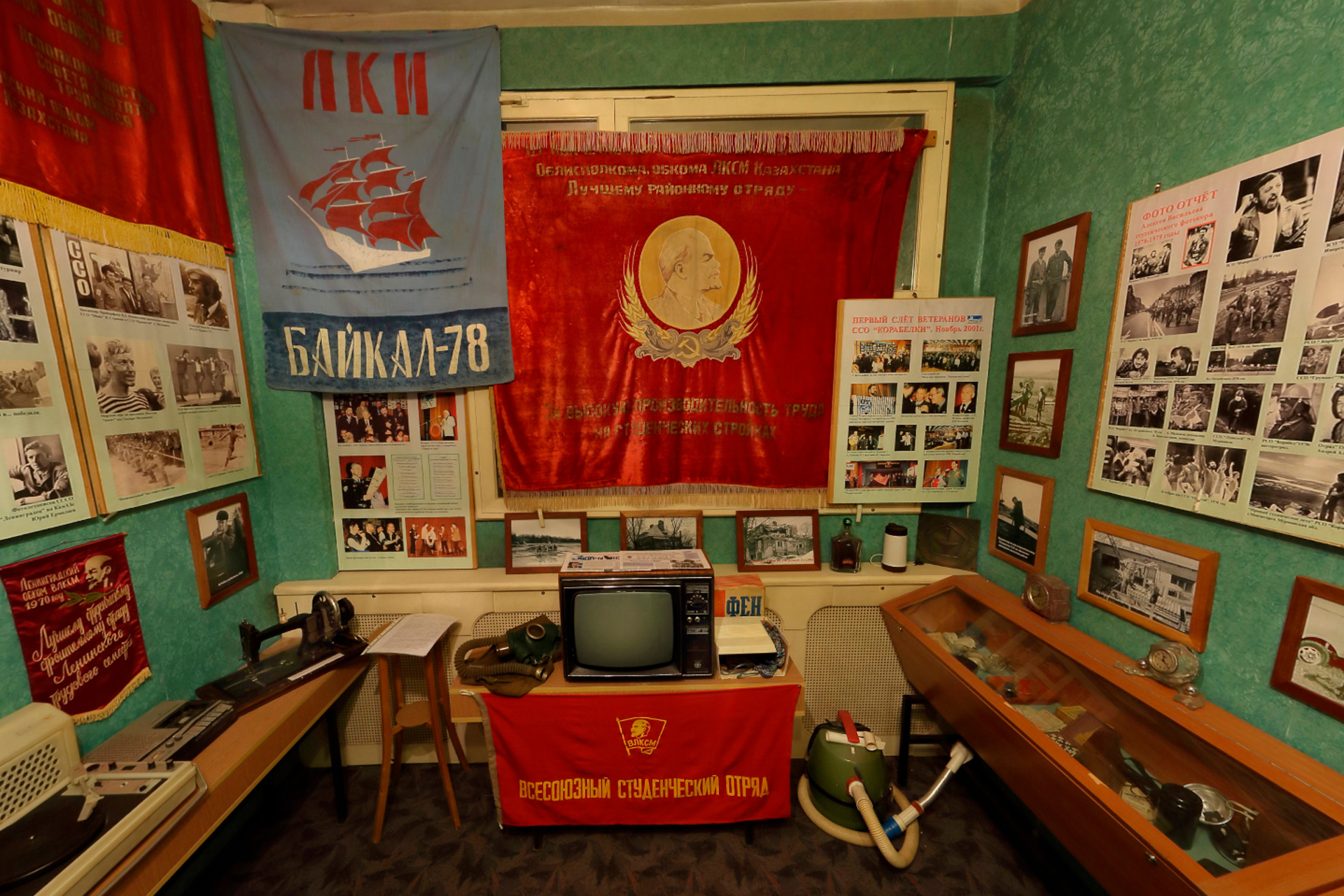 По стенам стройотрядовского зала развешаны флаги и вымпелы стройотрядов, вручную созданные студентами; здесь же на вешалке – хлопчатобумажная рабочая куртка, нашивки на которой недвусмысленно повествуют о её принадлежности студенту-стройотрядовцу.